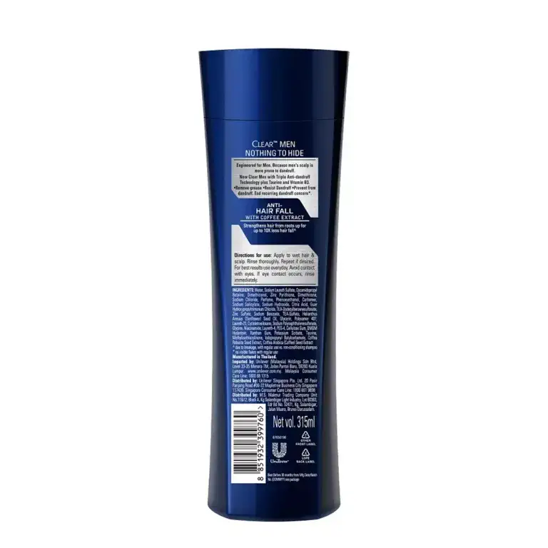 شامپو ضد ریزش مردانه کلیر نسخه تایلندی | Clear Men Anti Dandruff Shampoo (Anti Hair Fall) 315 ml با عصاره قهوه و فناوری Triple Anti-Dandruff، کاهش ریزش تا ۱۰ برابر، مناسب موهای مردانه مستعد شوره و ریزش، تقویتکننده ریشه و تمیزکننده عمقی پوست سر. محصول اصل تایلند با بستهبندی آبی تیره، خرید آنلاین با بهترین قیمت.